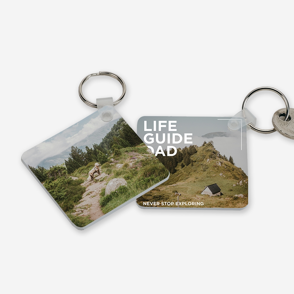 Produzido em acrílico resistente, este porta-chaves combina leveza e durabilidade. A personalização é feita por sublimação térmica nos dois lados, garantindo cores vivas e detalhes nítidos.